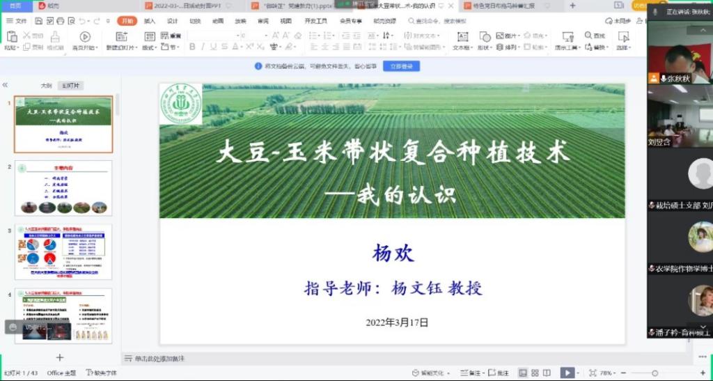 为凸显作物学科底蕴优势,展示优秀研究生党员的社会服务成果,塑造优良学风,3月17日晚,由农学院作物栽培与耕作学硕士生党支部主办,农学院作物学科其他研究生党支部共同协办的“晒农艺,树新风”主题党日活动在成都校区7教405举行。农学院党委书记黎明艳、作物学科各研究生党支部书记受邀参会,线上线下共计150余名研究生党员参加活动。