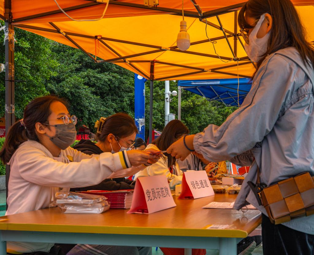 图为党员志愿者为新生发放资料