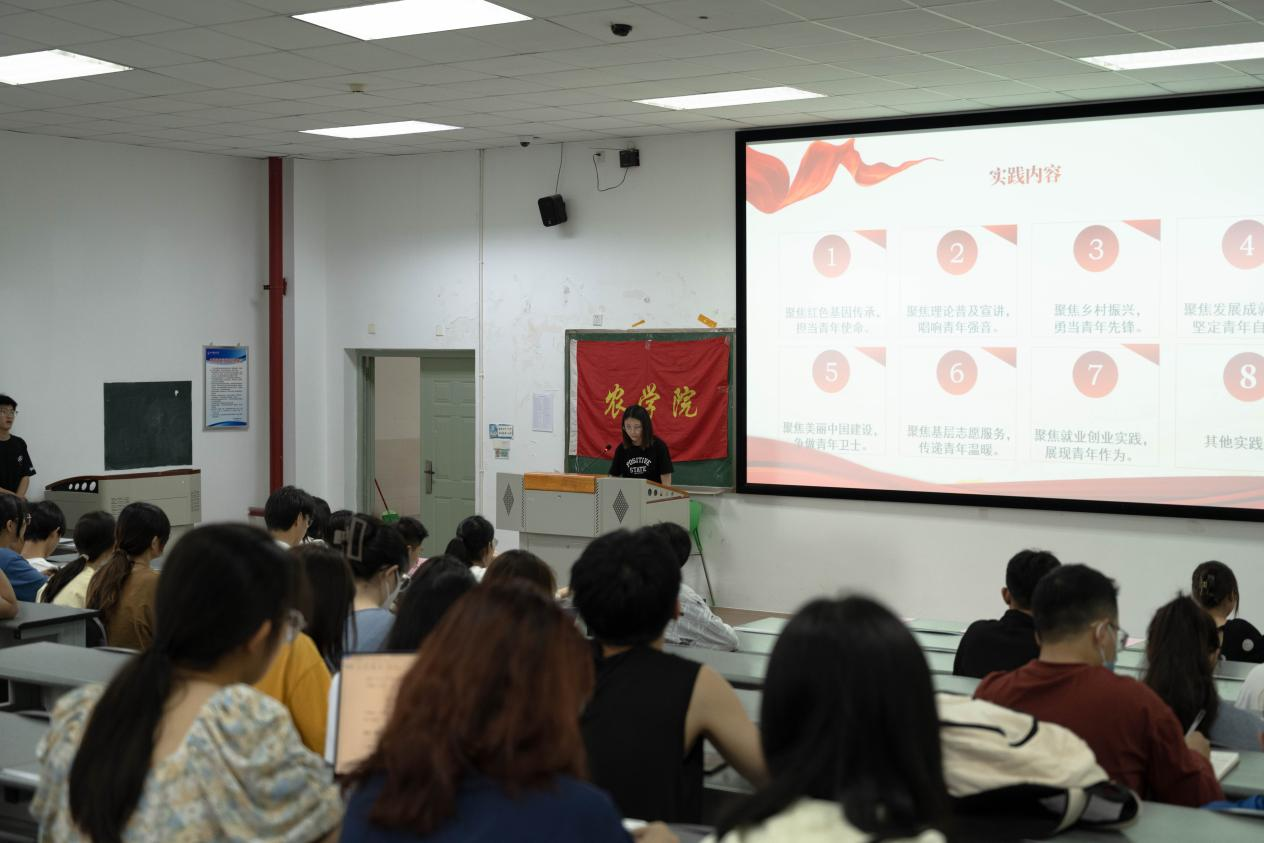 大会伊始,农学院团委实践部部长吴宇雪从实践内容、参与形式、评优评奖以及实践流程几个方面对本次暑期社会实践进行了详细介绍。她强调,此次社会实践专项内容丰富,除往年社会实践内容外,今年还新增大学生社区服务专项和乡村振兴青年先锋实践专项等项目,请同学们重点关注和积极参与。