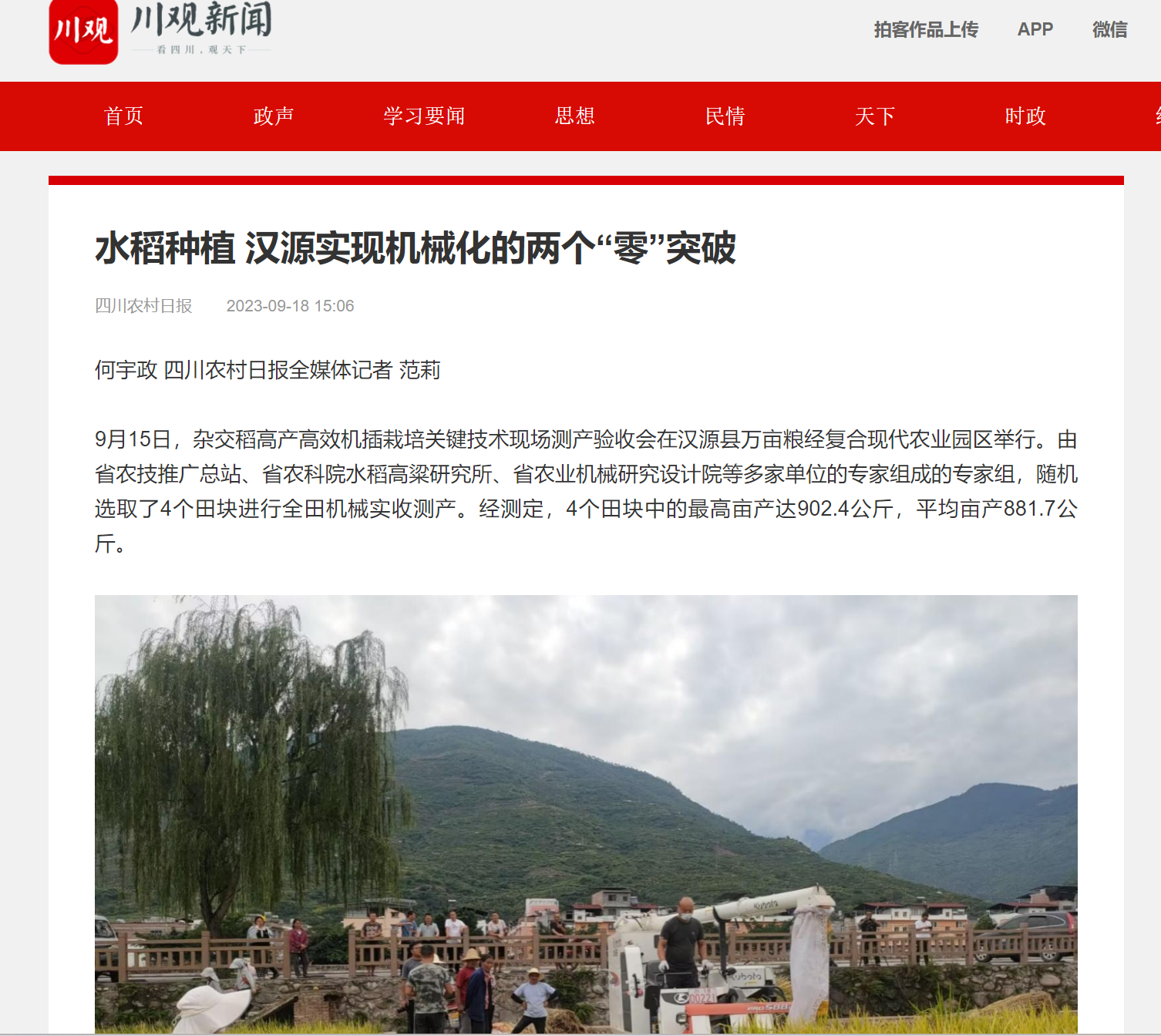 9月15日,杂交稻高产高效机插栽培关键技术现场测产验收会在汉源县万亩粮经复合现代农业园区举行。由省农技推广总站、省农科院水稻高粱研究所、省农业机械研究设计院等多家单位的专家组成的专家组,随机选取了4个田块进行全田机械实收测产。经测定,4个田块中的最高亩产达902.4公斤,平均亩产881.7公斤。