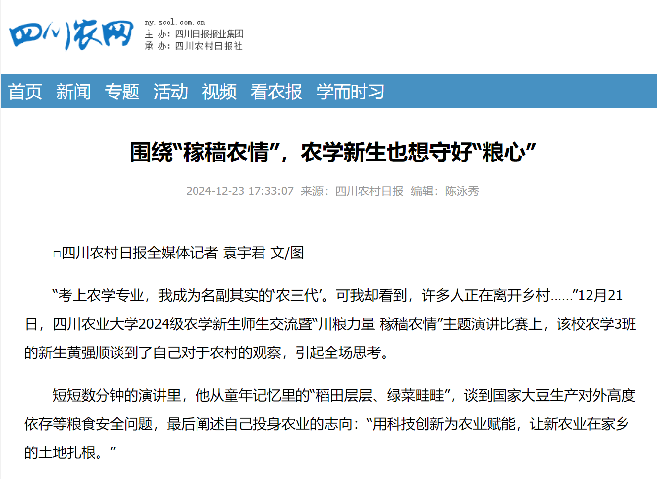 “考上农学专业,我成为名副其实的‘农三代’。可我却看到,许多人正在离开乡村……”12月21日,永利yl23411集团官网2024级农学新生师生交流暨“川粮力量 稼穑农情”主题演讲比赛上,该校农学3班的新生黄强顺谈到了自己对于农村的观察,引起全场思考。
