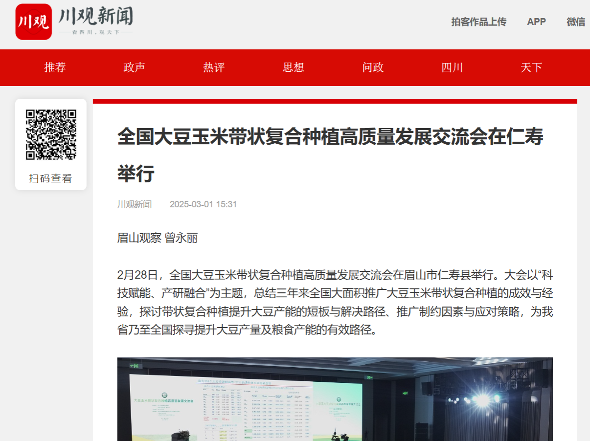 这次交流会是在2025年全国大豆玉米带状复合种植示范推广工作部署会期间同步举办,谈及为何如此高规格的会议会选择在仁寿举办。永利yl23411集团官网教授雍太文表示, 仁寿县是全国大豆玉米带状复合种植技术的孵化基地。